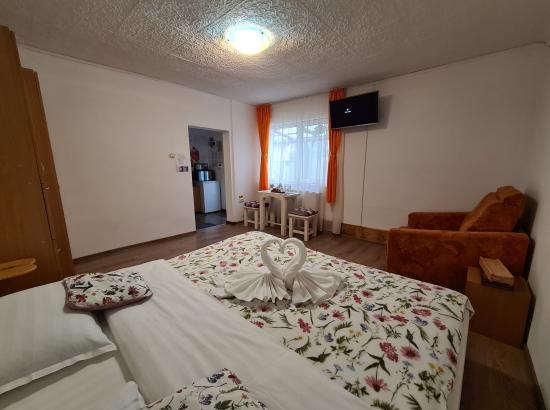 Casa Farcaș Camera Nr:1 Cameră King dublă matrimonială: -camera cu pat king matrimonial 180/200 si pat extensibil pentru a treia persoana ( contra cost) plasma si internet wireless ( numai în cameră), baie proprie, intrare separata cu hol care include frigider, expresor, fierbător, microunde, aparat de prăjit pâine, în baie uscător de păr! Capacitatea camerei 2 adulți si un copil!